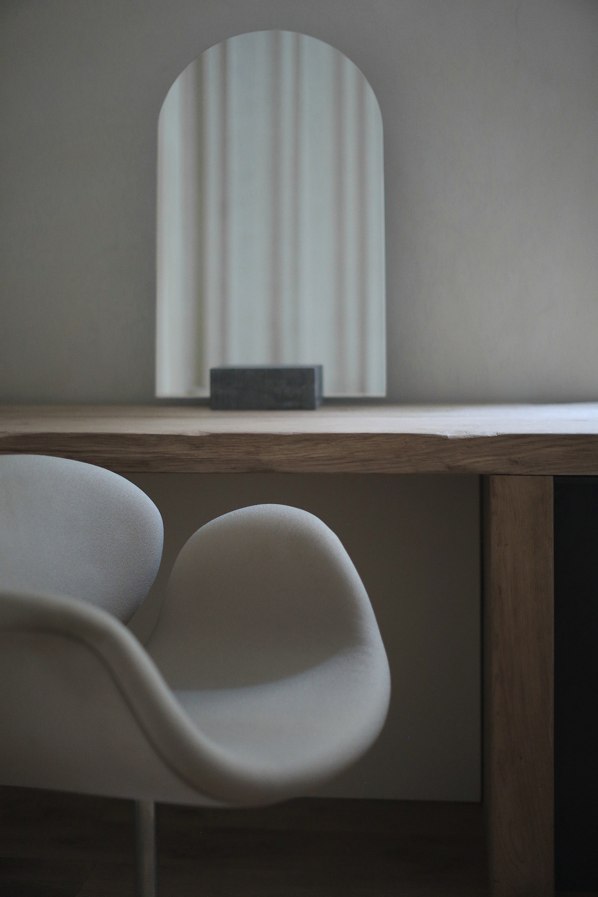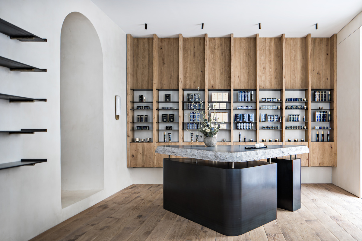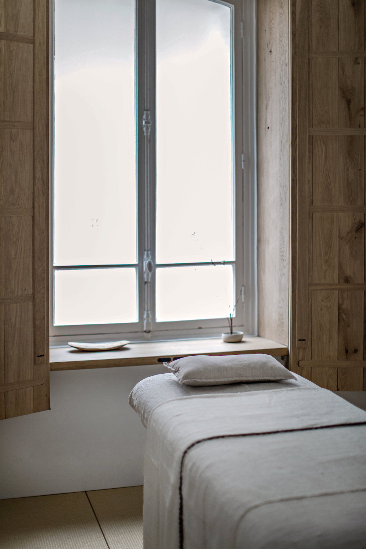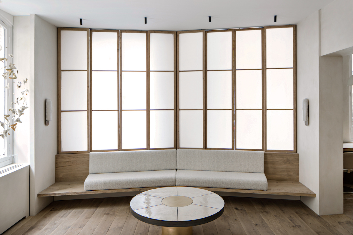 Пространство оформлено как частный интерьер, который отлично иллюстрирует двойное франко-японское начало. В элегантном салоне идеально сбалансирован ассортимент самых разнообразных материалов, таких как японская керамика раку, голубой известняк Эно, патинированный металл и матовая латунь.